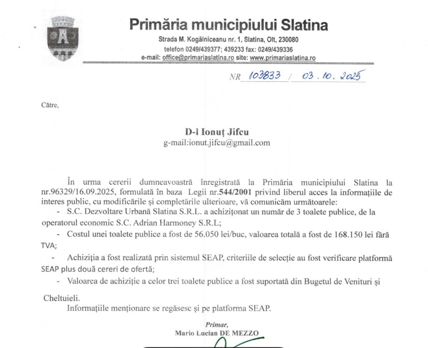 Potrivit unui răspuns venit din partea Primăriei Slatina, la o solicitare pe Legea 544/2001, SC Dezvoltare Urbană Slatina SRL a achiziţionat un număr de 3 toalete publice, de la firma SC Adrian Harmoney SRL.