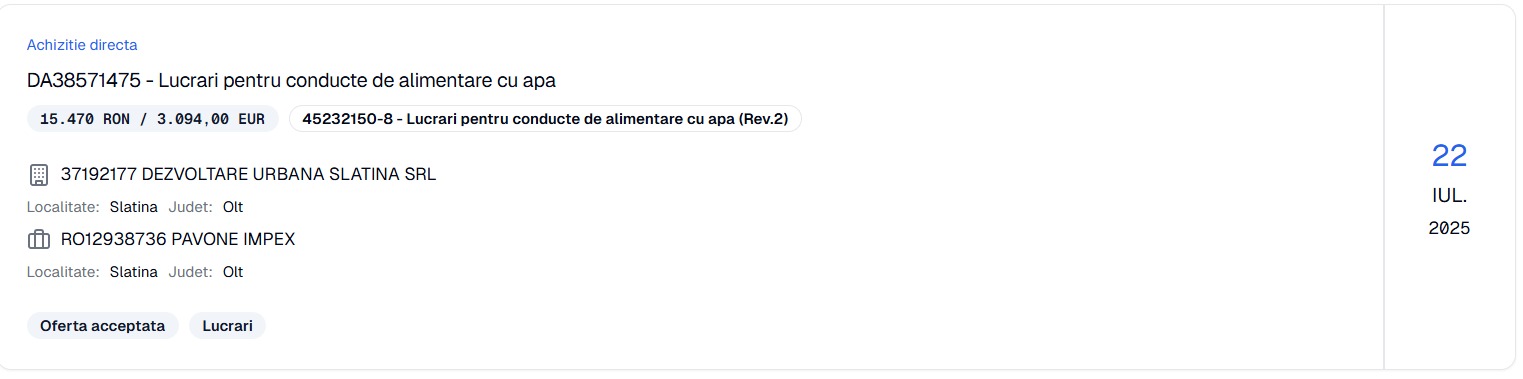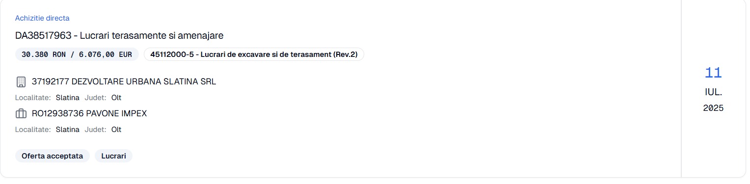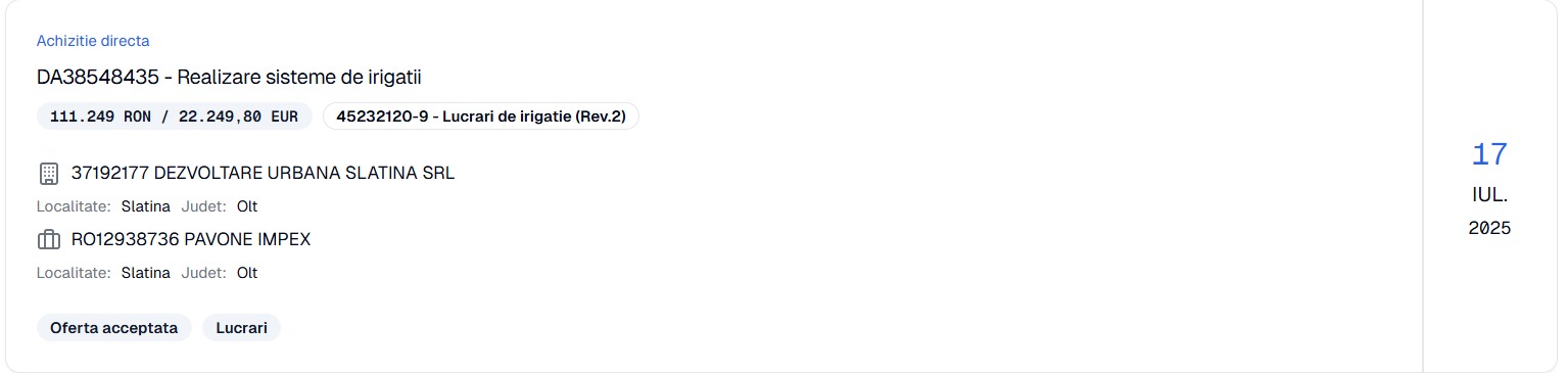 Potrivit datelor din sistemul de achiziţii publice (SICAP), firma se numeşte Pavone Impex SRL, iar în luna iulie a primit prin atribuire directă (cum altfel!?) trei contracte de la Dezvoltare Urbană Slatina: