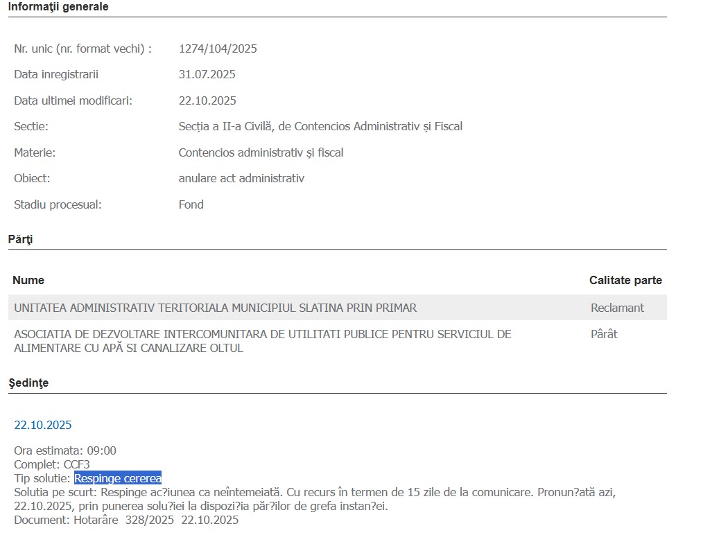 „Respinge acţiunea ca neîntemeiată. Cu recurs în termen de 15 zile de la comunicare. Pronunţată azi, 22.10.2025, prin punerea soluţiei la dispoziţia părţilor de grefa instanţei”, se arată în încheierea Tribunalului.