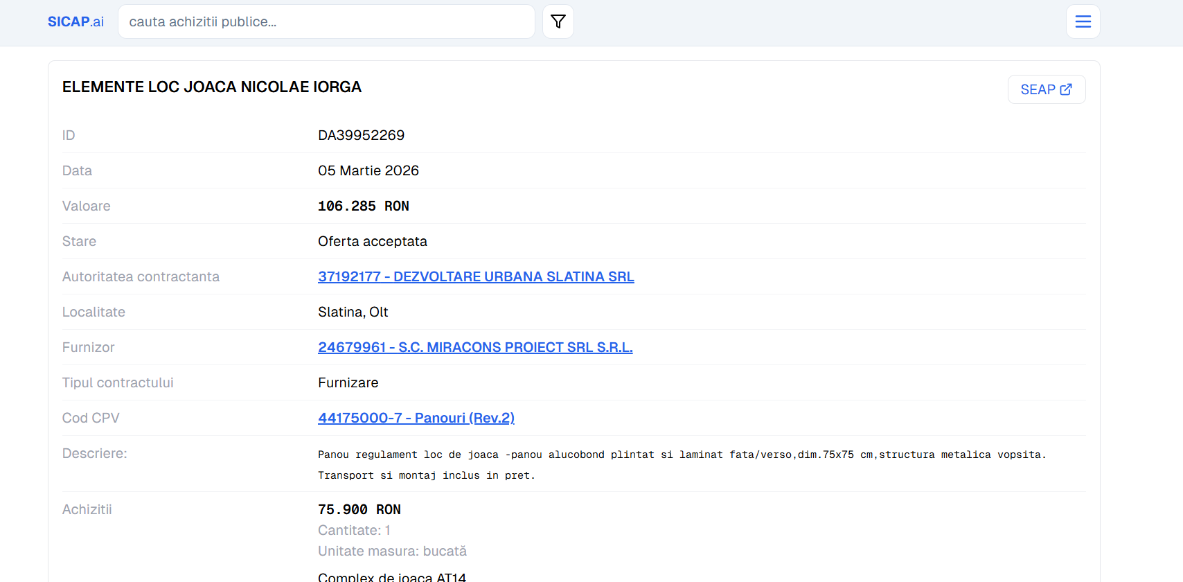 Cel mai recent contract atribuit, în valoare de 106.285 lei (aproximativ 21.000 euro), a fost publicat și finalizat în timp record, respectiv în mai puțin de 24 de ore. Documentația prevede dotarea spațiului de joacă cu echipamente și mobilier urban.