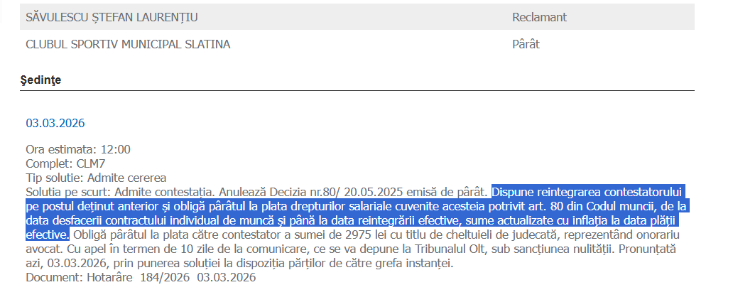 „Solutia pe scurt: Admite contestaţia. Anulează Decizia nr.80/ 20.05.2025 emisă de pârât. Dispune reintegrarea contestatorului pe postul deţinut anterior şi obligă pârâtul la plata drepturilor salariale cuvenite acesteia potrivit art. 80 din Codul muncii, de la data desfacerii contractului individual de muncă şi până la data reintegrării efective, sume actualizate cu inflaţia la data plăţii efective. Obligă pârâtul la plata către contestator a sumei de 2975 lei cu titlu de cheltuieli de judecată, reprezentând onorariu avocat. Cu apel în termen de 10 zile de la comunicare, ce se va depune la Tribunalul Olt, sub sancţiunea nulităţii. Pronunţată azi, 03.03.2026, prin punerea soluţiei la dispoziţia părţilor de către grefa instanţei”, se arată în încheierea postată pe portalul Tribunalului Olt.